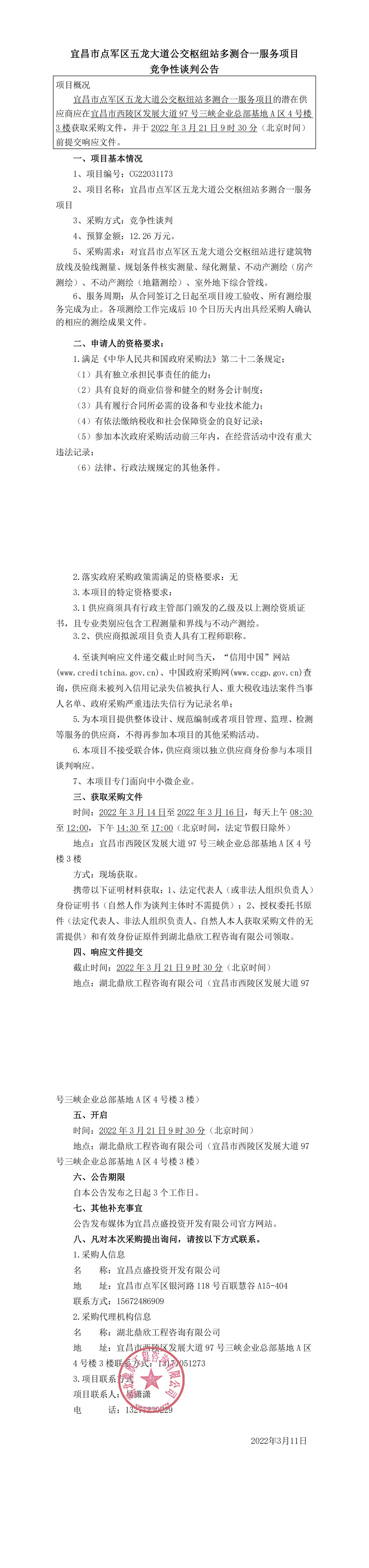 宜昌市點(diǎn)軍區(qū)五龍大道公交樞紐站多測合一服務(wù)項(xiàng)目競爭性談判公告