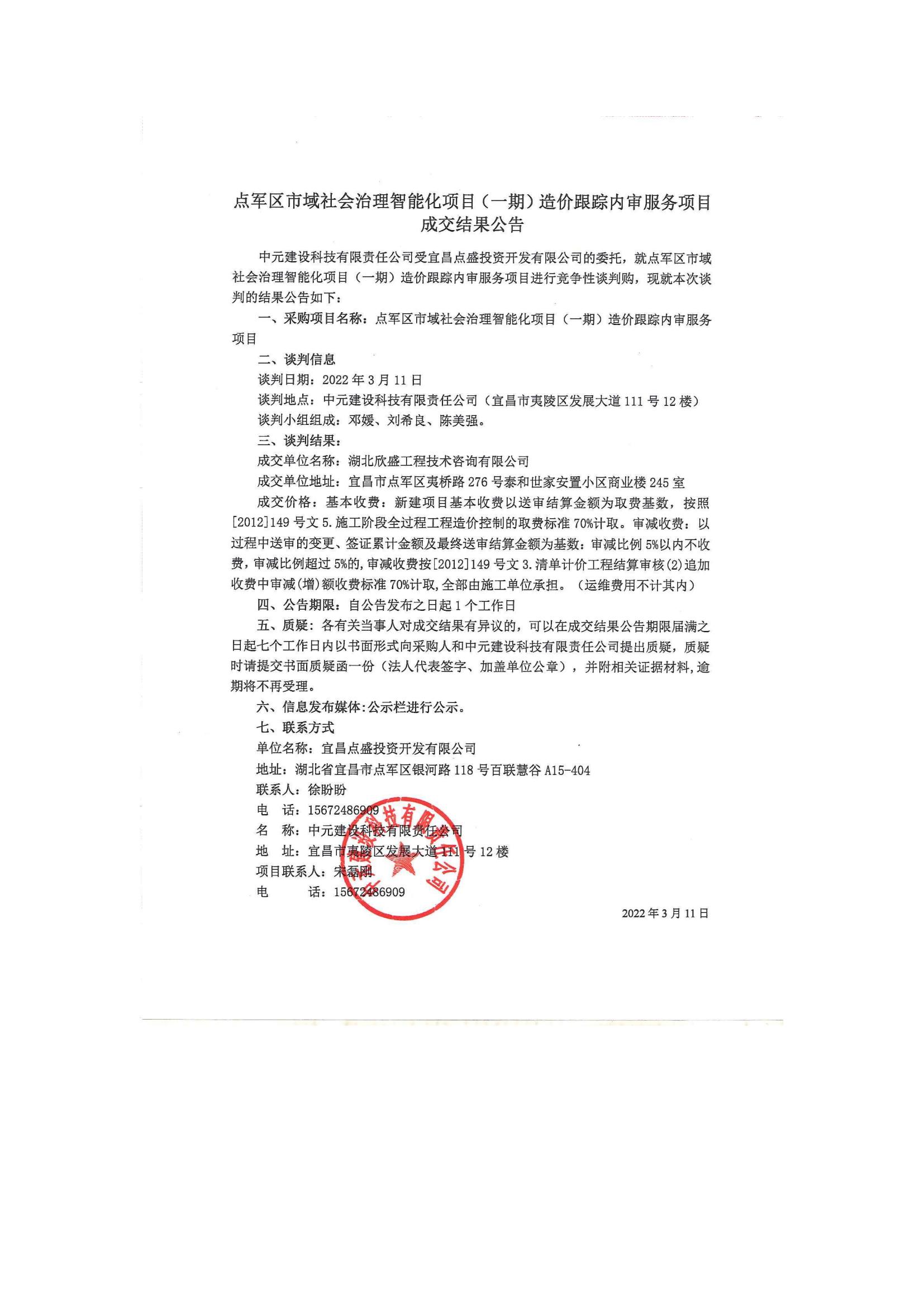 點軍區(qū)市域社會治理智能化項目(一期)造價跟蹤內(nèi)審服務(wù)項目成交公告