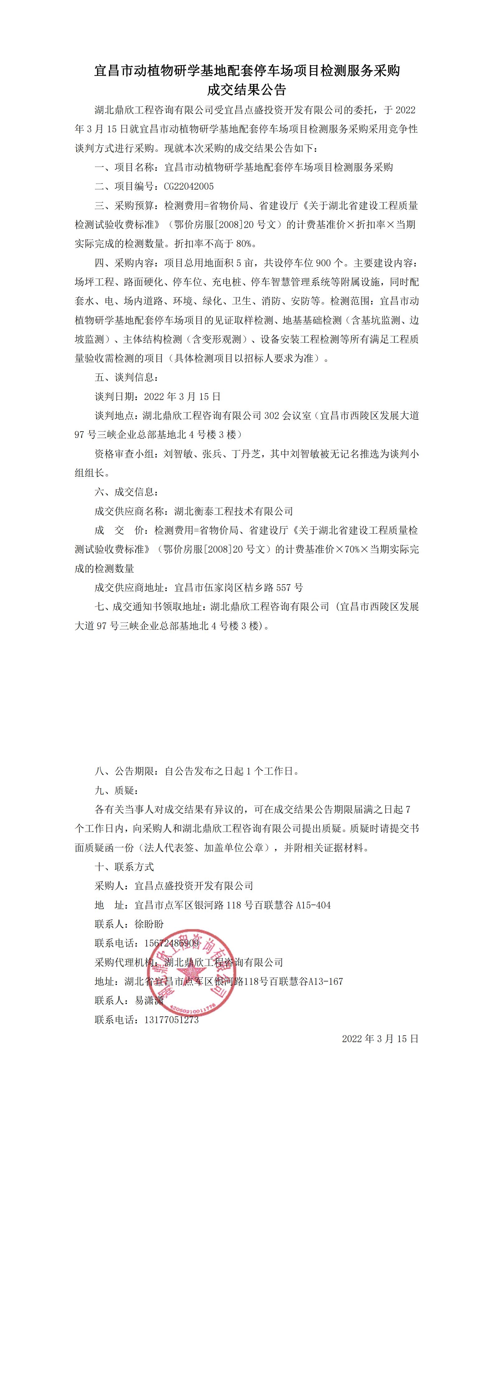 宜昌市動植物研學(xué)基地配套停車場檢測服務(wù)采購成交結(jié)果公告