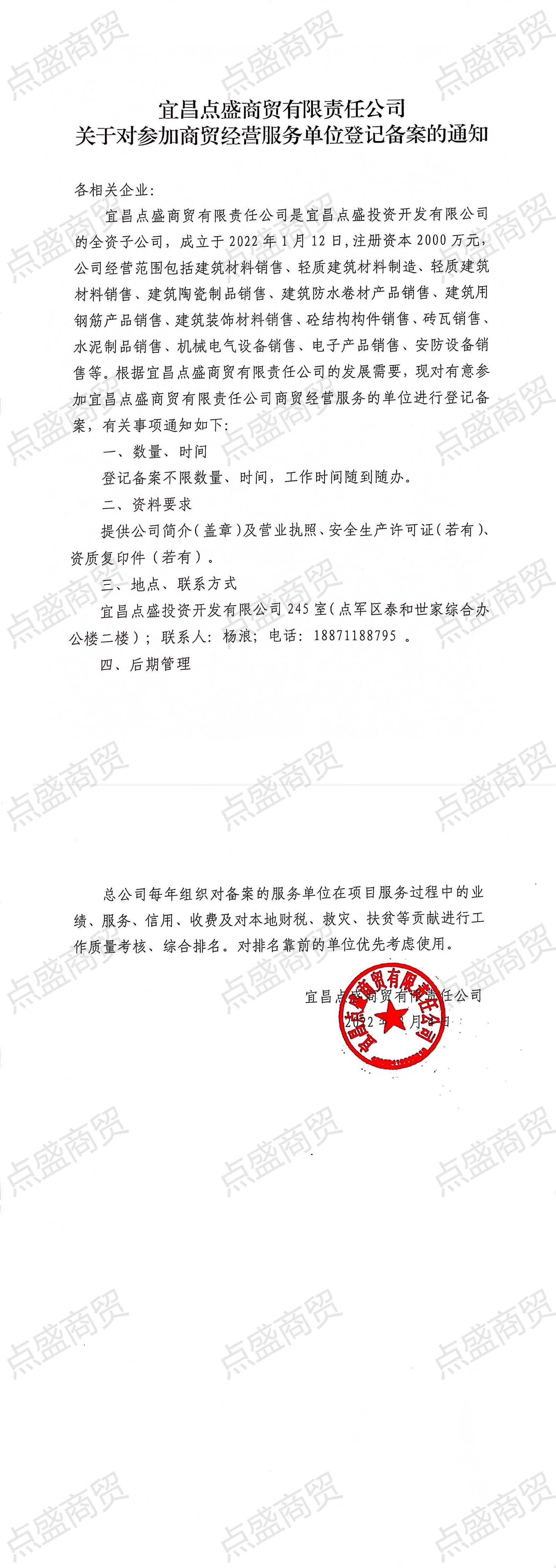 宜昌點(diǎn)盛商貿(mào)有限責(zé)任公司關(guān)于對(duì)參加商貿(mào)經(jīng)營服務(wù)單位登記備案的通知
