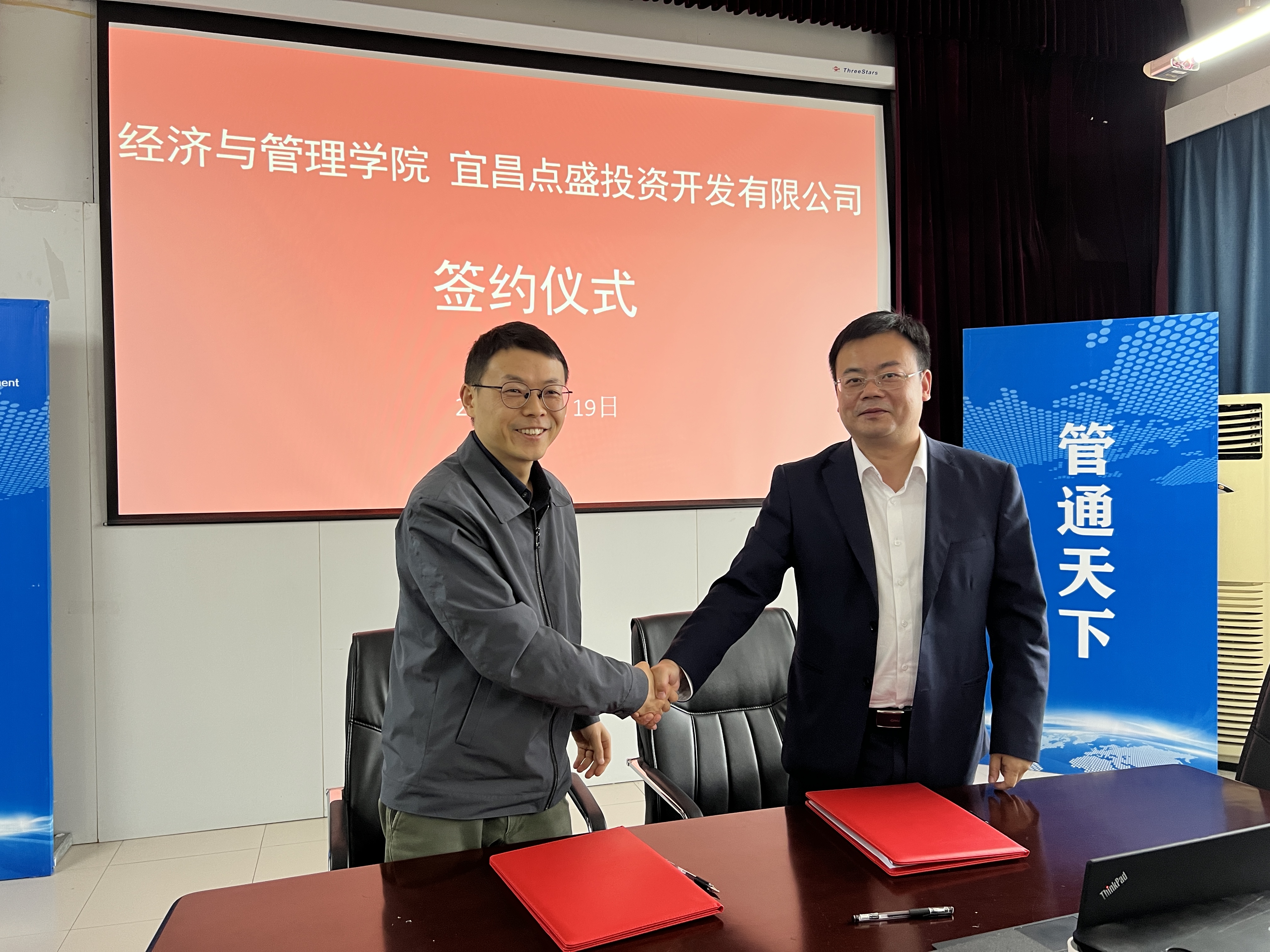 楊濤、覃朝暉代表雙方簽訂了《宜昌點(diǎn)盛投資開(kāi)發(fā)有限公司與三峽大學(xué)經(jīng)濟(jì)與管理學(xué)院戰(zhàn)略合作意向書(shū)》。