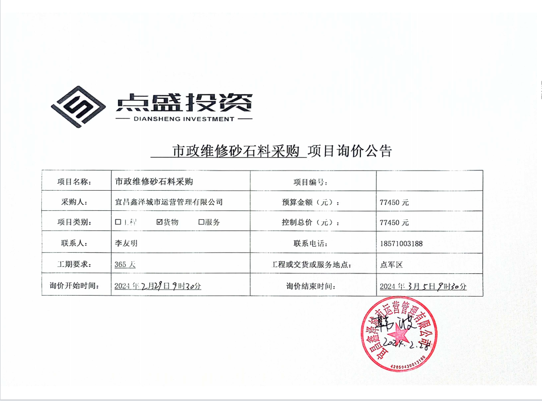宜昌鑫澤城市運(yùn)營管理有限公司市政維修砂石料采購項(xiàng)目詢價公告