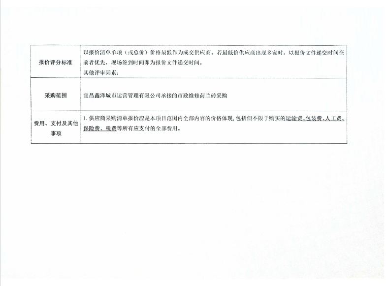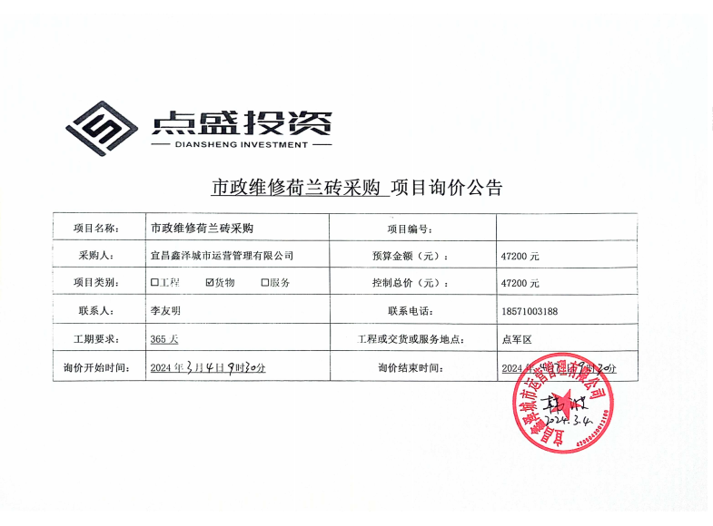 宜昌鑫澤城市運(yùn)營管理有限公司市政維修荷蘭磚采購項目詢價公告