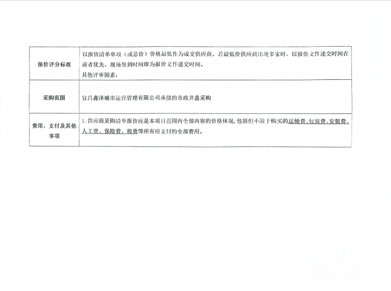 宜昌鑫澤城市運(yùn)營(yíng)管理有限公司市政井蓋采購(gòu)項(xiàng)目詢價(jià)公告