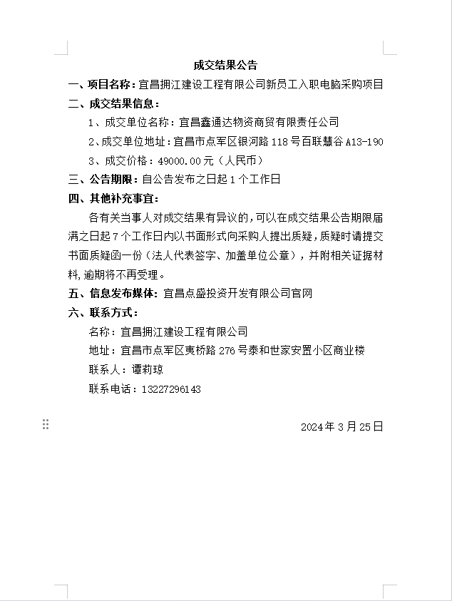 宜昌擁江建設工程有限公司新員工入職電腦采購項目成交公告