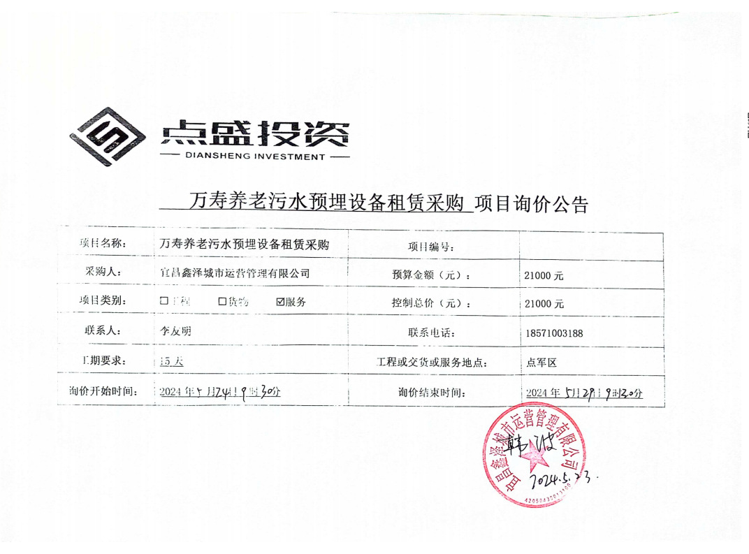萬壽養(yǎng)老污水預(yù)埋設(shè)備租賃采購詢價公告