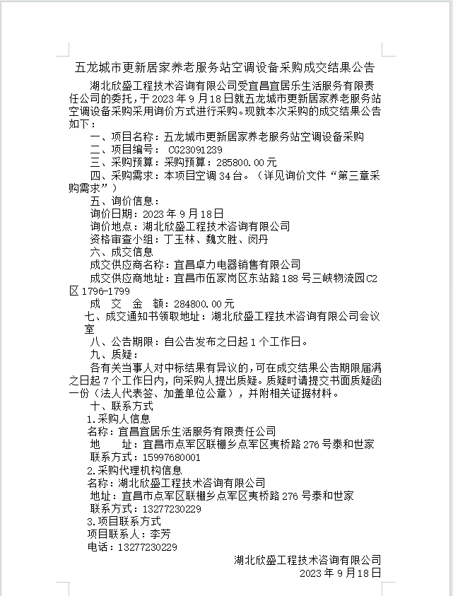 五龍城市更新居家養(yǎng)老服務站空調(diào)設備采購成交結果公告