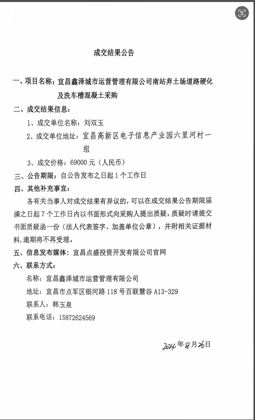 宜昌鑫澤城市運(yùn)營管理有限公司南站棄土場道路硬化及洗車槽混凝土采購項目成交公告