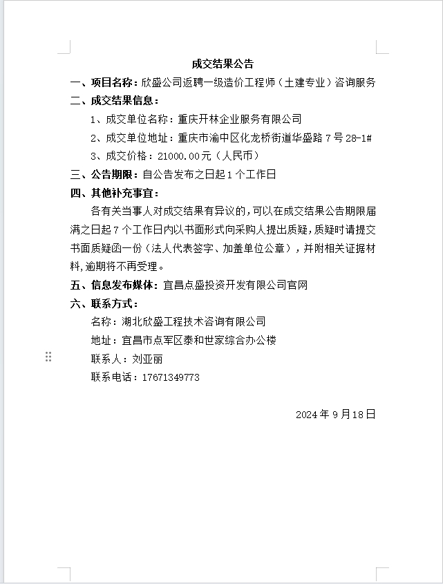 欣盛公司返聘一級(jí)造價(jià)工程師(土建專業(yè))咨詢服務(wù) 成交公告