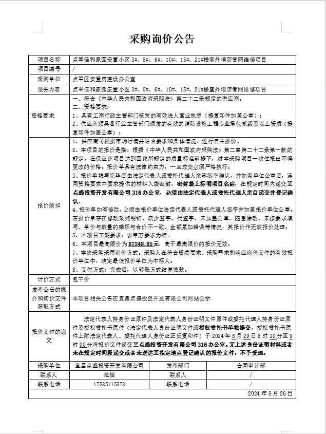 點(diǎn)軍佳和家園安置小區(qū)3#、5#、6#、10#、15#、21#樓室外消防管網(wǎng)維修項(xiàng)目詢價(jià)公告