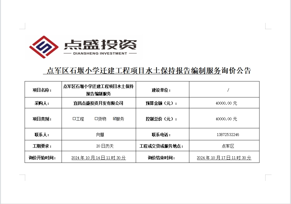 點軍區(qū)石堰小學(xué)遷建工程項目水土保持報告編制服務(wù)詢價公告