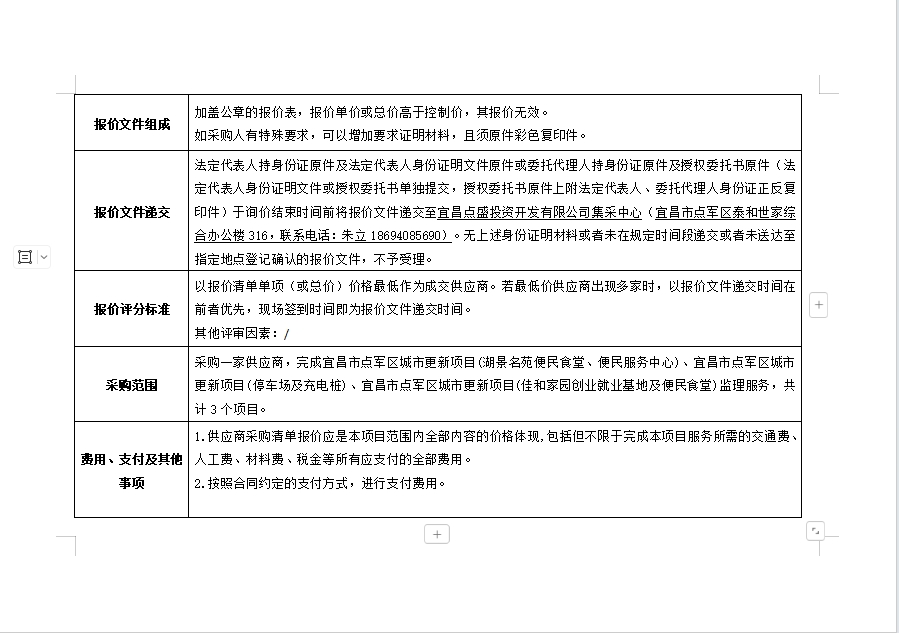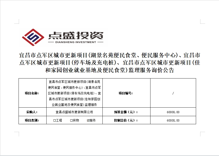 | 宜昌市點(diǎn)軍區(qū)城市更新項(xiàng)目(湖景名苑便民食堂、便民服務(wù)中心)、宜昌市點(diǎn)軍區(qū)城市更新項(xiàng)目(停車場(chǎng)及充電樁)、宜昌市點(diǎn)軍區(qū)城市更新項(xiàng)目(佳和家園創(chuàng)業(yè)就業(yè)基地及便民食堂)監(jiān)理服務(wù)詢價(jià)公告 |