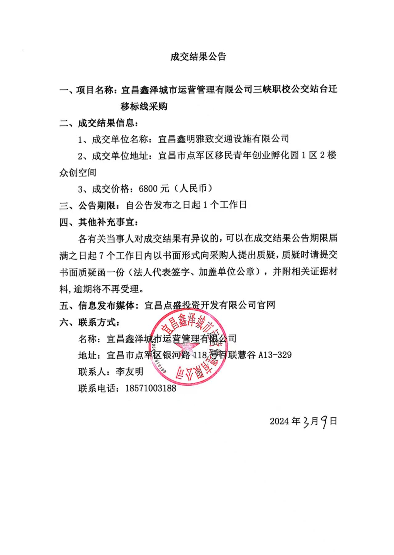 三峽職校公交站臺(tái)遷移標(biāo)線采購成交公告